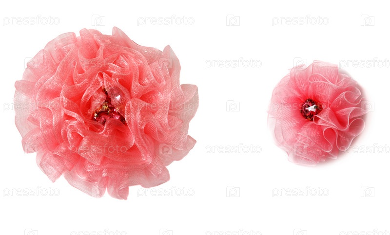 Две розовые тканевые хризантемы на белом фоне