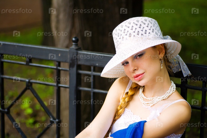 Портрет молодой дамы в белой шляпе, сидящей на скамейке
