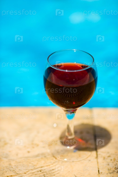 Бокал красного вина на краю бассейна