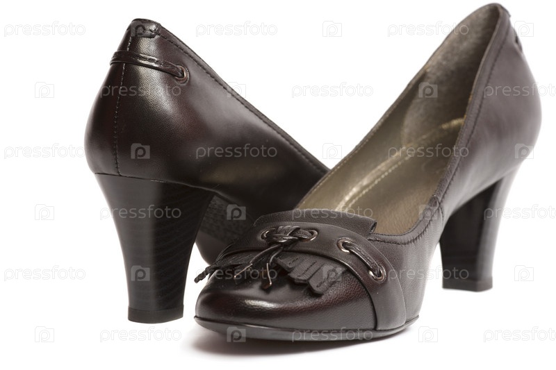 Пара женских черных классических туфель на белом фоне