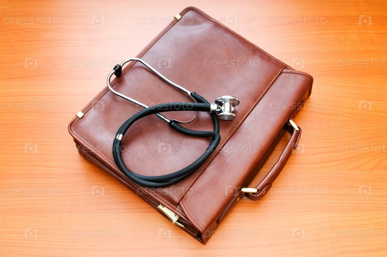 Стетоскоп и портфель лежат на столе