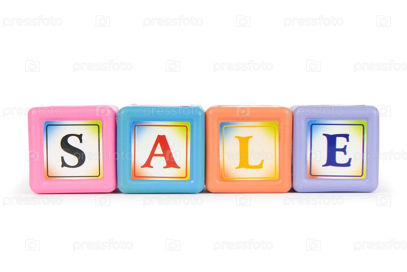 Слово SALE выложенное из кубиков на белом фоне