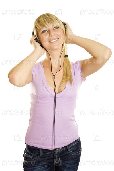 Блондинка с наушниками на белом фоне
