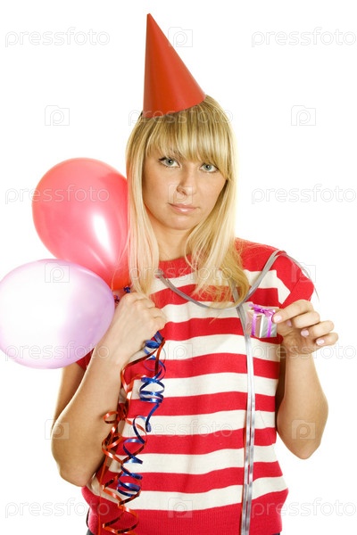 Блондинка с шарами и праздничным колпаком на белом фоне