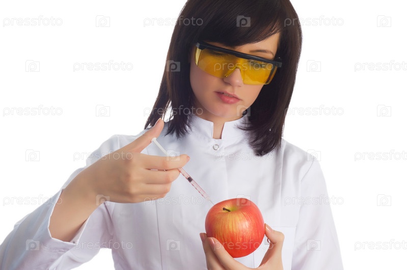 Женщина - ученый делает инъекцию в яблоко