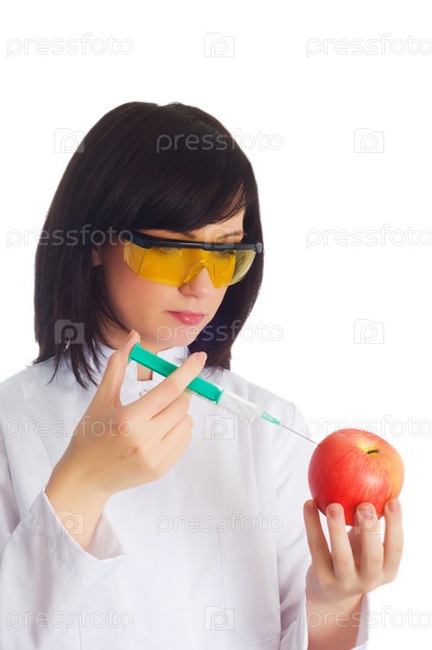 Женщина - ученый делает инъекцию в яблоко