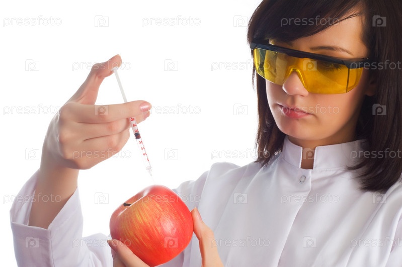 Женщина - ученый делает инъекцию в яблоко