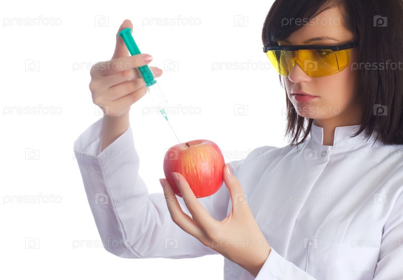 Женщина - ученый делает инъекцию в яблоко