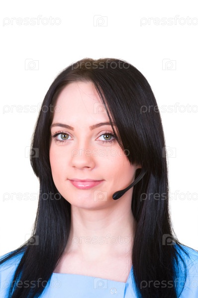Брюнетка с гарнитурой на белом фоне