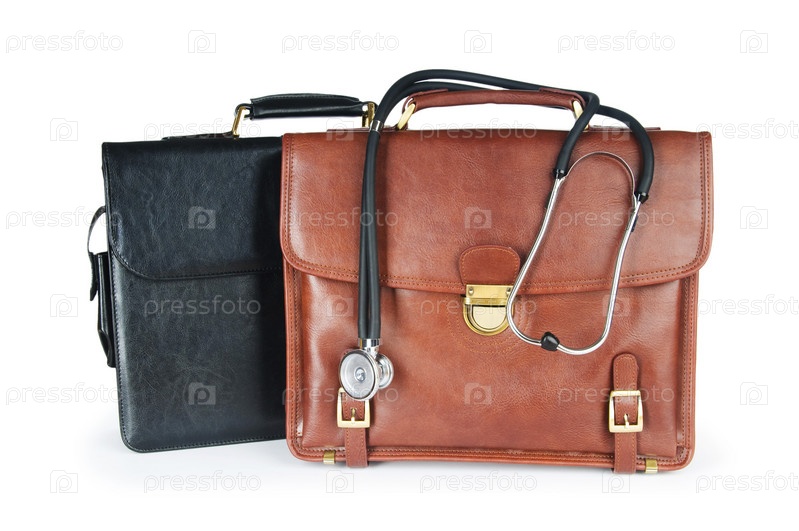 Кожаные портфели и стетоскоп на белом фоне
