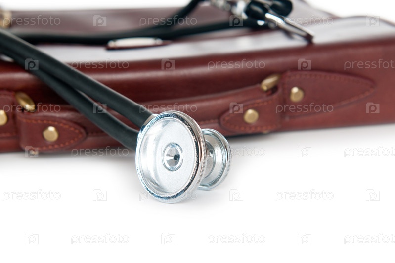 Кожаный докторский портфель и стетоскоп на белом фоне