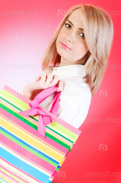 Блондинка с пакетом на ярком фоне