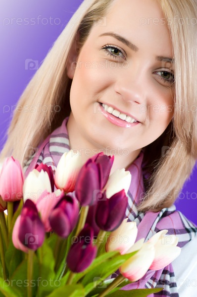 Блондинка с букетом тюльпанов на ярком фоне