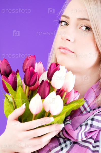 Блондинка с букетом тюльпанов на ярком фоне