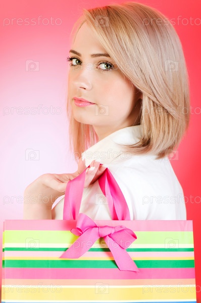 Блондинка с пакетом на ярком фоне