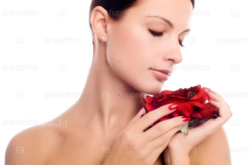 Портрет свежей и красивой женщины с глазами цветка, изолированными на белом