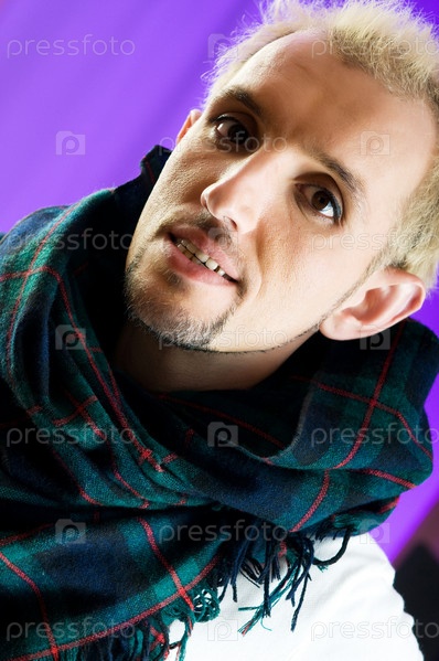 Молодой человек в клетчатом шарфе на цветном фоне