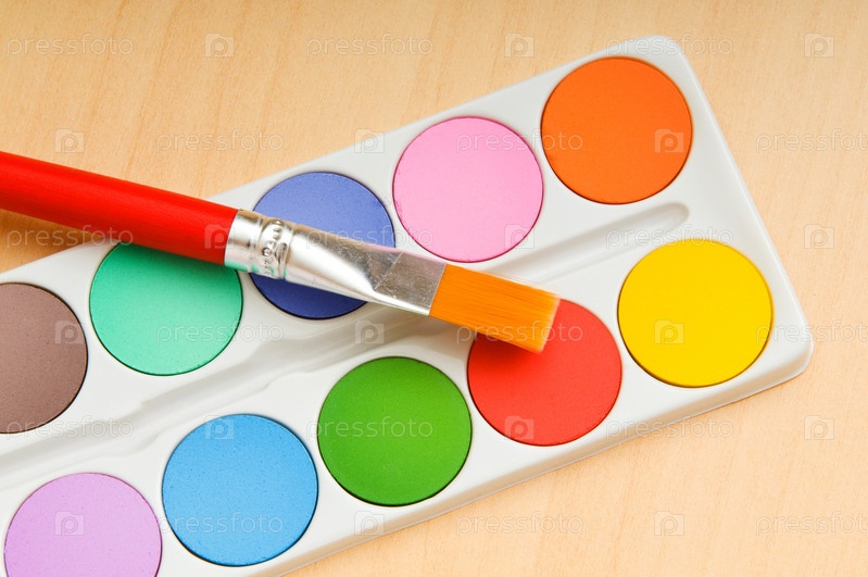 Акварельные краски и кисть, лежащие на столе