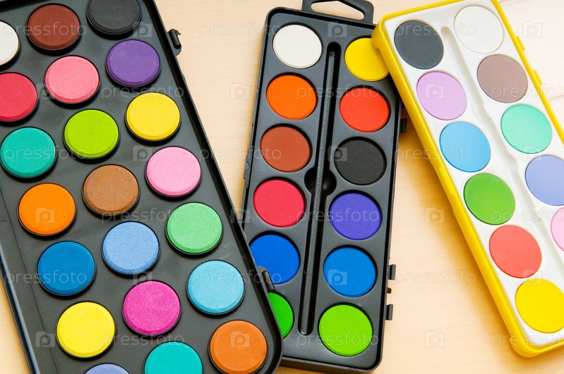 Наборы акварельных красок, разложенные на столе