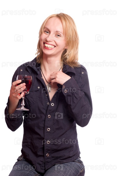 Молодая счастливая женщина с бокалом вина на белом фоне