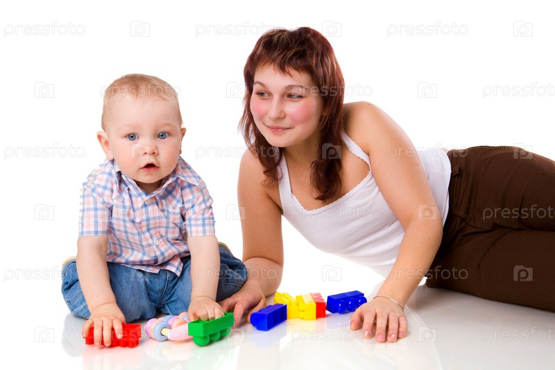 Мать с сыном играют вместе на белом фоне