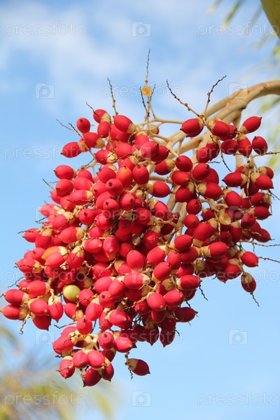 Красные ягоды кизила крупным планом на фоне неба