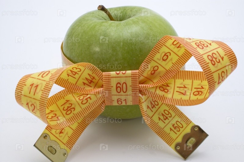 Зеленое яблоко, перевязанное измерительной лентой