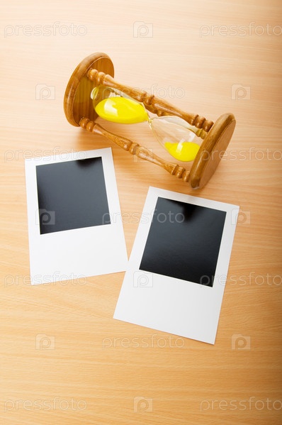 Пустые рамки для фотографий и песочные часы на фоне деревянного стола