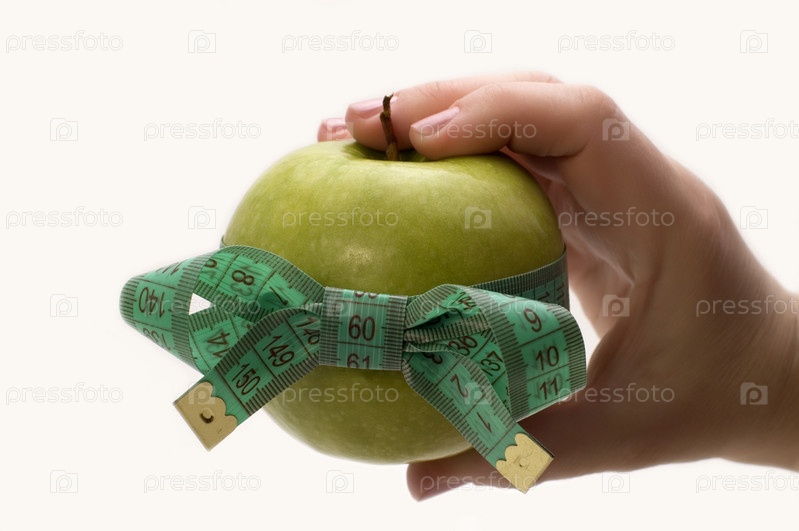 Зеленое яблоко, перевязанное измерительной лентой, в женской руке