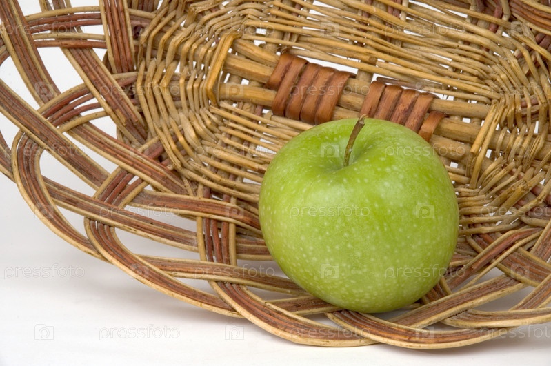 Красивое зеленое яблоко в плетеной вазе