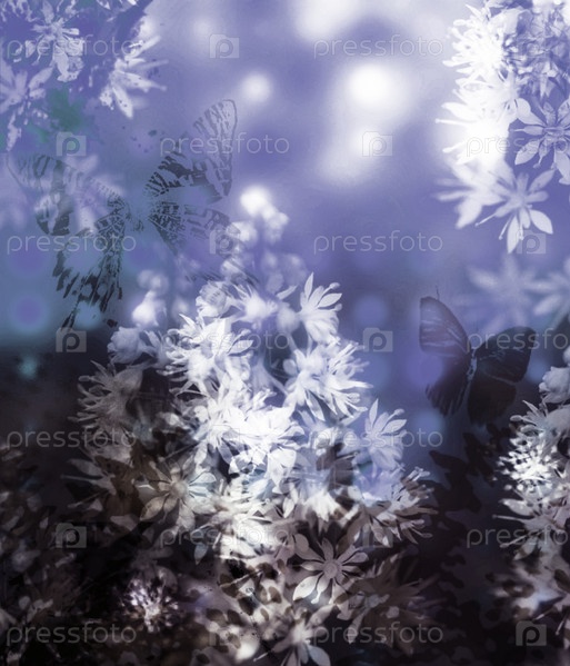 Бабочки и белые цветы на сиреневом фоне