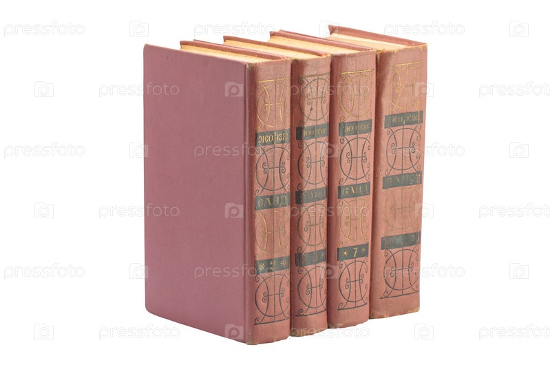 Старые книги стоят в ряд на белом фоне