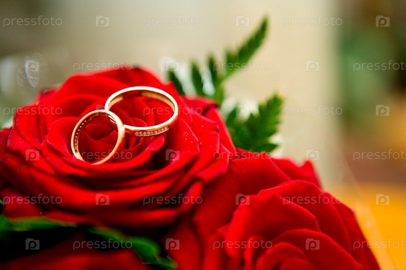 Два обручальных кольца на красной розе