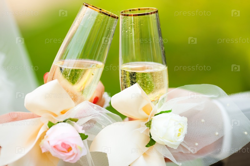 Два бокала с шампанским в руках новобрачных на зеленом фоне