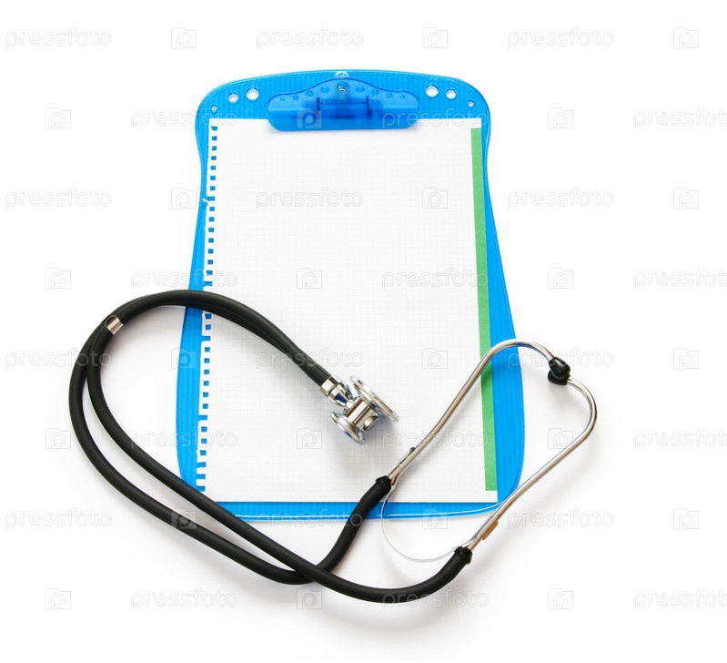 Стетоскоп и планшет с листом бумаги на белом фоне