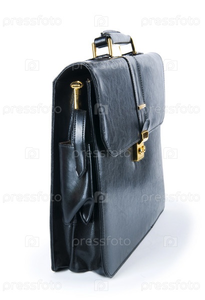 Мужской кожаный портфель на белом фоне. Вид сбоку