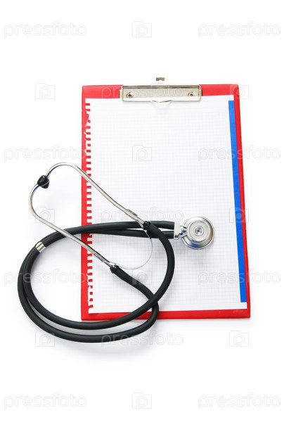 Стетоскоп и папка-планшет на белом фоне