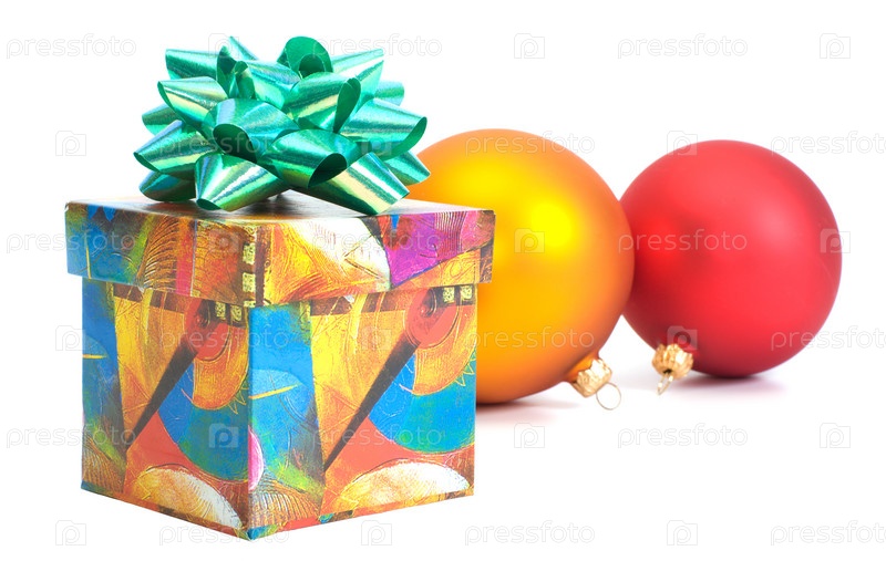 Подарочная коробка и новогодние шары на белом фоне
