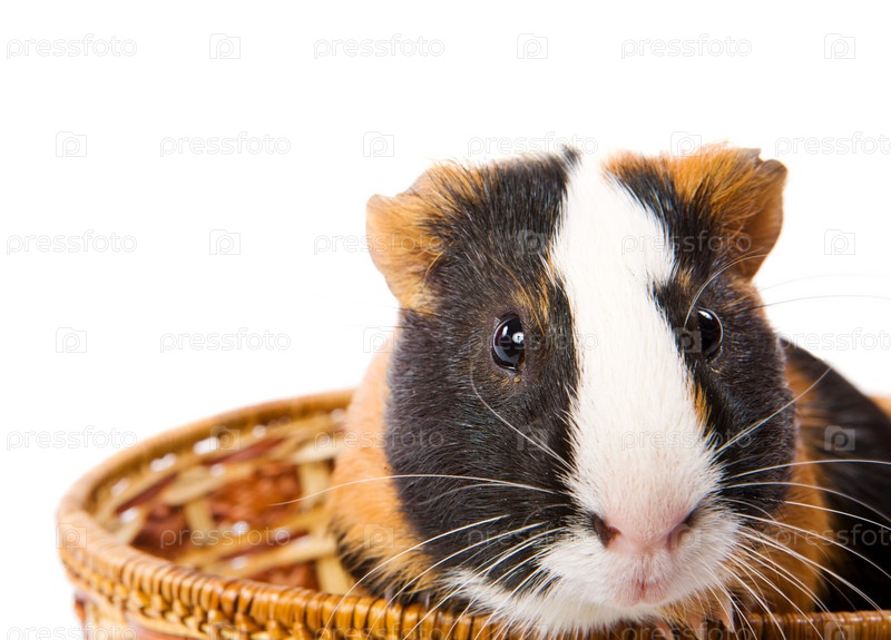 Морская свинка в корзине, изолированные на белом фоне