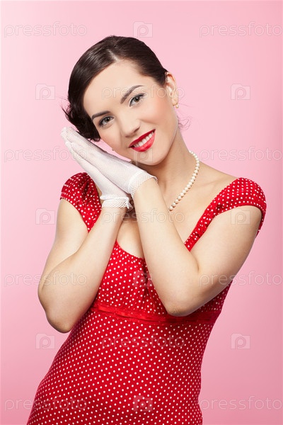 Улыбающаяся девушка, одетая в ретро стиле и белых перчатках