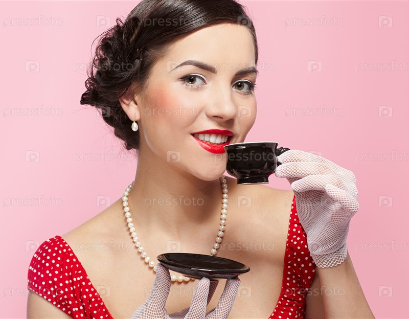 Красивая девушка с чашкой кофе, одетая в ретро стиле и белых перчатках
