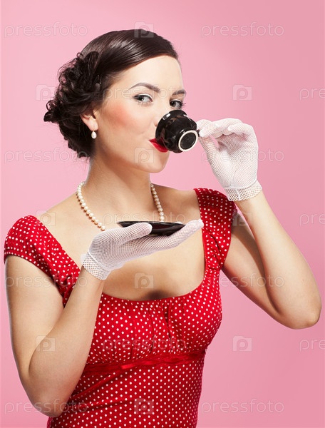 Красивая девушка с чашкой кофе, одетая в ретро стиле и белых перчатках