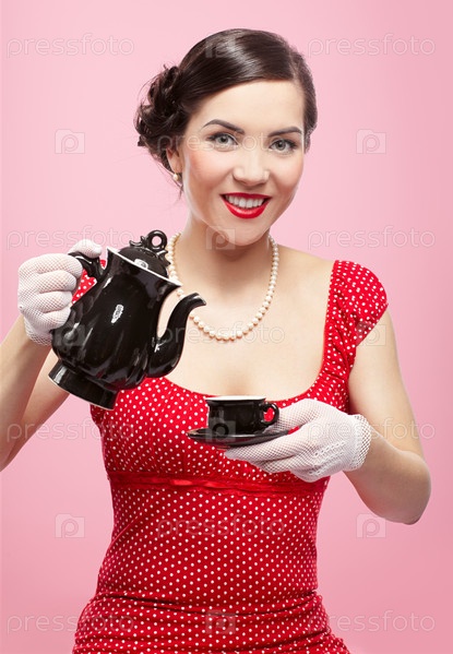 Красивая девушка, одетая в ретро стиле и белых перчатках, наливает чай в чашку