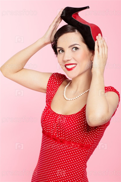 Красивая девушка, одетая в ретро стиле, приложила к голове туфлю