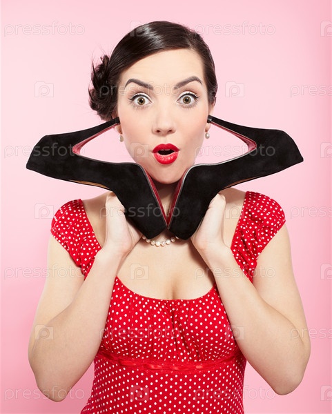 Удивленная девушка, одетая в ретро стиле, держит в руках туфли