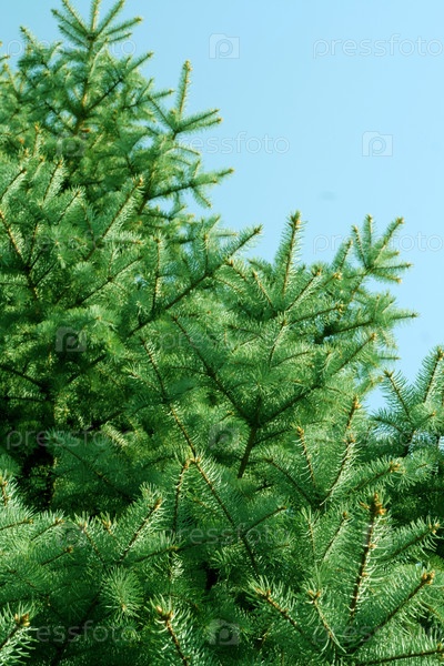 Ветви ели крупным планом на фоне голубого неба