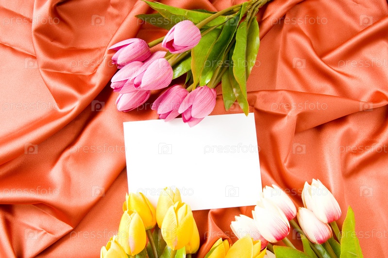 Конверт и тюльпаны, лежащие на атласной ткани