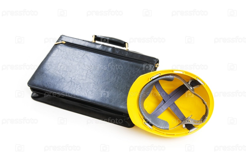 Защитная каска и кожаный мужской портфель на белом фоне