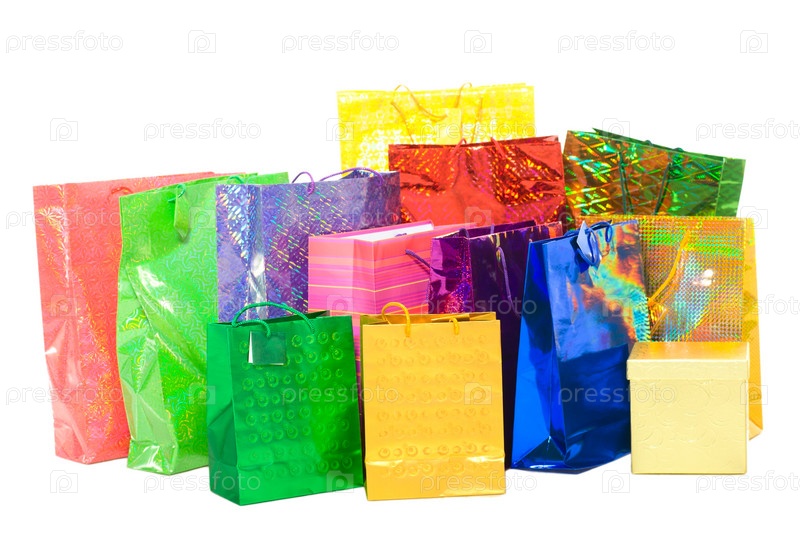 Разноцветные подарочные пакеты на белом фоне