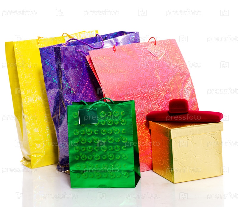 Разноцветные подарочные пакеты на белом фоне
